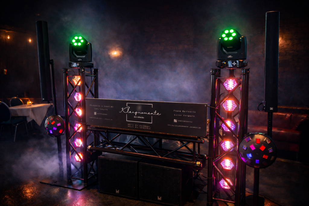 Hier bekommt ihr kein Standard-Setup, sondern ein durchdachtes Gesamtpaket aus professioneller Ton- und Lichttechnik. Ein schwarzes Traversensystem mit integrierter Technik sorgt für eine klare, hochwertige Optik und maximale Wirkung auf der Tanzfläche.