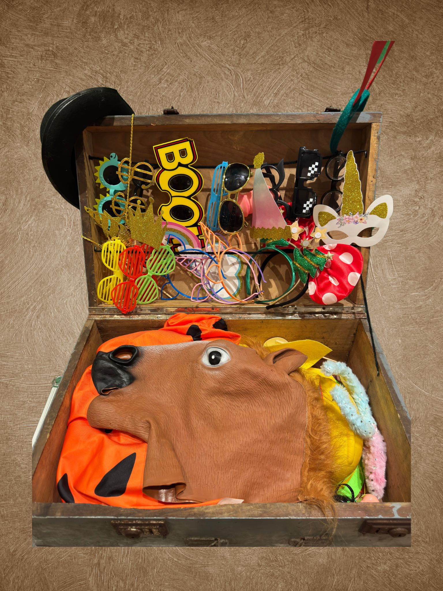 Inklusive Hintergrundsystem (bei ausreichend Platz) und Requisiten.